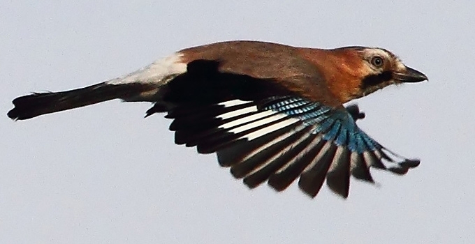 Patinas ir patelė rusvai pilki. Viršugalvis juodai dryžuotas. Uodega ir dėmes po akimis juodos. Antuodegis ir dėmės sparnuose balti. Sparno priekinėje dalyje ryškiai mėlyna, su juodais dryžiais dėmė. Pauodegys balsvas. Snapas juodas. Kojos rudai rusvos. Rainelė rudai balta. Jaunikiui viršugalvis neaiškiai dryžuotas. Rainelė rudai pilka. Jie išsirita pilki, žiotys rausvos.